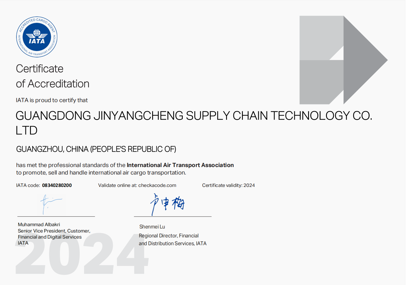 此次IATA资质的获得,是国际航空运输协会对金羊城空运服务质量和运营效率的高度肯定,意味着金羊城集团具备更强的实力和信誉,体现了金羊城在空运服务市场上的高度专业性和卓越性。